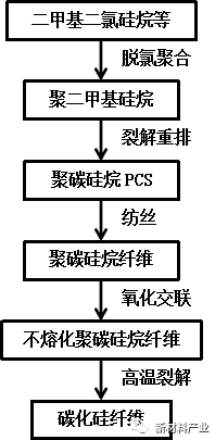 一、 碳化硅纖維的制備方法 碳化硅纖維的制備方法主要有先驅(qū)體轉(zhuǎn)化法、化學(xué)氣相沉積法(CVD)和活性炭纖維轉(zhuǎn)化法3種。3種制備方法各有優(yōu)缺點,而且使用不同制備方法制備的碳化硅纖維也具有不同的性能。 1.先驅(qū)體轉(zhuǎn)化法 先驅(qū)體轉(zhuǎn)化法是由日本東北大學(xué)矢島教授等人于1975年研發(fā),包括先驅(qū)體合成、熔融紡絲、不熔化處理與高溫燒結(jié)4大工序,具體工藝流程如圖1所示。先驅(qū)體轉(zhuǎn)化法制備碳化硅纖維需要先合成先驅(qū)體——聚碳硅烷(PCS),矢島教授以二甲基二氯硅烷等為原料,通過脫氯聚合為聚二甲基硅烷,再經(jīng)過高溫(450~500℃)分解處理轉(zhuǎn)化為PCS,采用熔融法在250~350℃下將PCS紡成連續(xù)PCS纖維,然后經(jīng)過空氣中約200℃的氧化交聯(lián)得到不熔化PCS纖維,最后在高純氮氣保護下1 300℃左右裂解得到碳化硅纖維[3]。先驅(qū)體轉(zhuǎn)化法制備原理其實就是將含有目標元素的高聚物合成先驅(qū)體,再將先驅(qū)體紡絲成有機纖維,然后通過一些列化學(xué)反應(yīng)將有機纖維交聯(lián)成無機陶瓷纖維。 圖1 先驅(qū)體轉(zhuǎn)化法制備碳化硅纖維的過程 自矢島教授在實驗室利用先驅(qū)體轉(zhuǎn)化法成功制備碳化硅纖維后,日本、美國等國家的材料制造公司嘗試利用先驅(qū)體轉(zhuǎn)化法將碳化硅纖維進行工業(yè)化生產(chǎn)。日本碳公司在1980年首次采用先驅(qū)體轉(zhuǎn)化法制備碳化硅纖維,但尚未形成工業(yè)化生產(chǎn)水平。1985年該公司開始利用該方法進行工業(yè)化生產(chǎn)。隨著各家公司不斷改進碳化硅的制備技術(shù),逐漸形成了3代碳化硅纖維。第1代碳化硅纖維是以日本碳公司生產(chǎn)的Nicalon 200和TyrannoLOX-M為代表。Nicalon 200采用矢島教授研發(fā)的方法制備而成。由于在制備過程中引入了氧,纖維中的氧質(zhì)量分數(shù)為10%~15%,在高溫下碳化硅纖維的穩(wěn)定性變差,影響了纖維在高溫環(huán)境下的強度和彈性模量。因此,為改善這個問題研制了第2代碳化硅纖維。第2代碳化硅纖維以日本碳公司的Hi-Nicalon與宇部興產(chǎn)公司的Tyranno LOX-E、Tyranno ZM和Tyranno ZE為代表,在無氧氣氛中采用電子輻照對原纖維進行不熔化處理,利用這種方式來降低碳化硅纖維中的氧含量,從而保障其在高溫環(huán)境下的穩(wěn)定性。為滿足航空和軍工領(lǐng)域?qū)Ω邷夭牧闲阅艿母咭?,日本和美國分別開發(fā)了第3代碳化硅纖維,以日本碳公司的Hi-Nicalon S和宇部興產(chǎn)公司的Tyranno SA,以及美國道康寧公司的Sylramic纖維為代表。第3代碳化硅纖維中的雜質(zhì)氧、游離碳含量進一步降低,接近碳化硅的化學(xué)計量比[4]。雖然第3代碳化硅纖維的雜質(zhì)氧、游離碳含量減少,但是目前控制纖維中的硅(Si)和碳(C)的比例,減少氧含量依舊是該制備方法研究的重點。 先驅(qū)體轉(zhuǎn)化法制備碳化硅纖維是目前采用比較廣泛的一種方法,技術(shù)相對成熟、生產(chǎn)效率高、成本低,適合于工業(yè)化生產(chǎn)。目前,我國的技術(shù)與日本、美國等國家還存在一定差距。國防科技大學(xué)是國內(nèi)最早開始研發(fā)碳化硅纖維制備的高校,制得了具有較好力學(xué)性能的連續(xù)碳化硅纖維及含鈦碳化硅纖維。廈門大學(xué)在張立同院士的帶領(lǐng)下建立專門的實驗室,與國際合作共同研發(fā)碳化硅纖維的制備方法,以電子束輻射和熱化學(xué)交聯(lián)的方式,制得低氧含量的交聯(lián)纖維[5]。實驗室研發(fā)的產(chǎn)品與日本同類型產(chǎn)品水平相近,但是生產(chǎn)水平還尚未達到工業(yè)化生產(chǎn)規(guī)模,有待進一步研究。